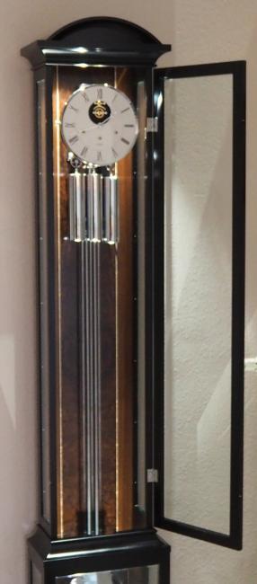 Elegante Standuhr in Schleiflack schwarz / Nussbaum mit Wurzelholz und Intarsien. Besonders hochwertig gearbeitete. Alle Gläser sind facettiert. Einzigartiges Das Zifferblatt ist einzigartig gearbeitet. Sie sehen die offenen ruhenden Hemmung (Graham) mit Kieniramic® Ankerpaletten. Hochwertiges, verchromtes Werk und Gitter-Langpendel mit Kompensation. Die LED Beleuchtung setzt die Uhr besonders in Szene. Ebenso ist ein Sie ein Hingucker durch den unteren offenen Kasten, der einen Durchblick zur Pendelscheibe erlaubt. Eine Uhr, die neue Maßstäbe setzt.