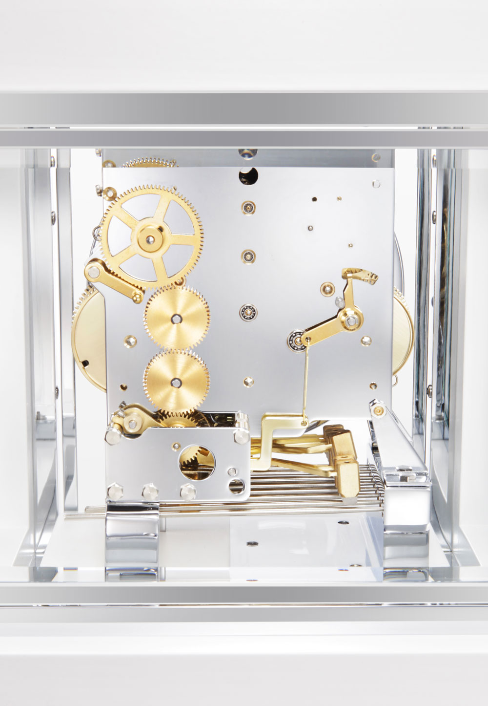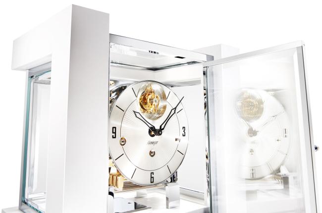Dreidimensionale massive Holzkonstruktion in einer weißen Hochglanz "piano-finish" Oberfläche auf 4 Chromfüßen. Die Glaseinheiten erlauben einen ungestörten Blick auf das Uhrwerk , bestehen jeweils aus einer aufwendigen Chrom-Rahmenkonstruktion und beinhalten insgesamt 5 facettierte Kristallgläser und 2 Türen. Ein versilberter Messingzahlenreif mit Sekundenanzeige und feine Breguet-Zeiger runden das ungewöhnliche Design ab.