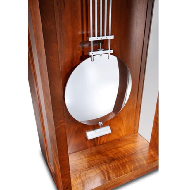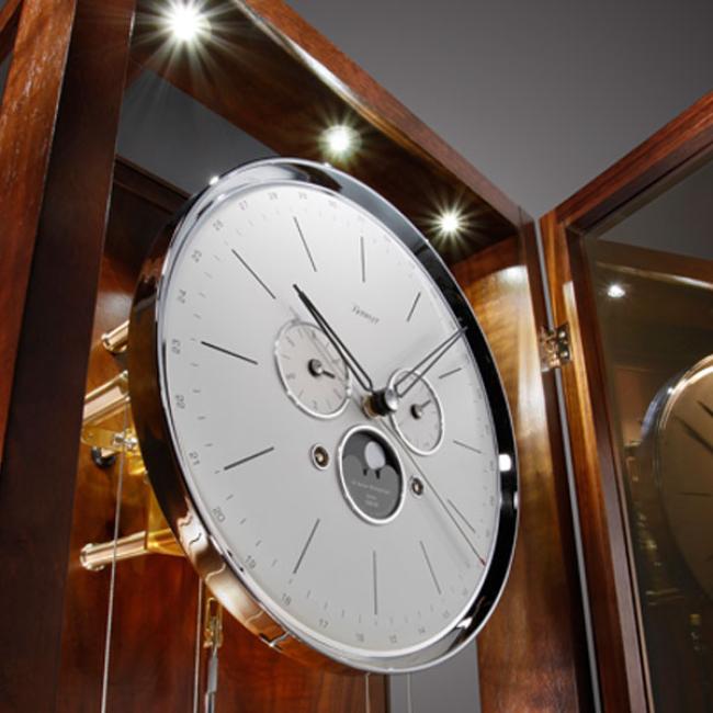 Die spezielle Pendel- und Gewichtsaufhängung gewährleistet eine reibungslose Funktion. Der imposante Halbstundenschlag erfolgt auf verdeckt montierten 8-Gongstäben mit Bim-Bam-Schlag. Das Kalendariumszifferblatt zeigt Datum, Wochentag, Monat und Mondphasen an.
